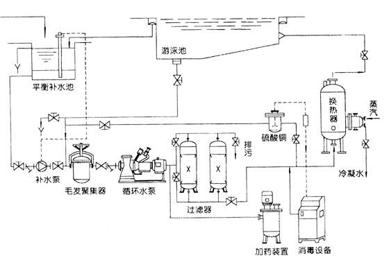 (1)把重點(diǎn)放在水處理除污能力和確保高質(zhì)量出水上。從中外游泳池,凡開群眾場(chǎng)時(shí),到了夏季人流高峰期,水質(zhì)變壞的事實(shí)看,無論多短的循環(huán)周期,無論多大的循環(huán)流量都無濟(jì)于事,那么,還要再縮短周期多少?再加大循環(huán)流量多少?還要用多大的代價(jià)才能使水質(zhì)改善?誠(chéng)然不是辦法。為何單純砂濾顯得無能為力呢?因?yàn)榭s短循環(huán)周期,加大循環(huán)流量的結(jié)果是,一次次的在密閉容器里穿透,形成無效空轉(zhuǎn)。有人要問,為何不加藥絮凝?眾所周知,這種池水的絮凝效果很難令人滿意。能不能把主攻方向改變一下呢?試想,我們把主攻方向改變?yōu)樵黾映勰芰,確保出水質(zhì)量和水的氧化與活化上,情形就會(huì)完全不一樣了。大家都有這樣的經(jīng)驗(yàn),在沒有水處理的換水泳池。第一天注入的新鮮水,在人流高峰期的夏季也是不會(huì)壞的,第二天也沒有壞,第三天開始才明顯變壞。有水處理設(shè)備的水質(zhì)變壞也不是1~2天的事情,而是多日水處理不達(dá)標(biāo)累積造成的。假如我們天天真正做到都能處理一遍,使這有限的一池水,成為高質(zhì)量的新鮮水,應(yīng)該是沒有問題的。我們?cè)囍@樣做了,在上百個(gè)館池和水上樂園取得了巨大成功。