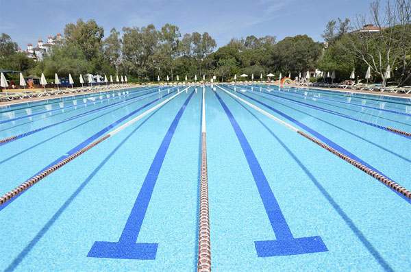 國際及國家級競賽游泳池應為50m(長)×25m(寬)×2m(深),10條泳道。國家級及。ㄊ校┘壐傎惓匾部蔀50m(長)×21m(寬)×2m(深),8條泳道,兩端池壁自水面上30cm至水面下80cm長度范圍內的長度誤差在安裝自動計時觸版后,應為0.00~0.01m。