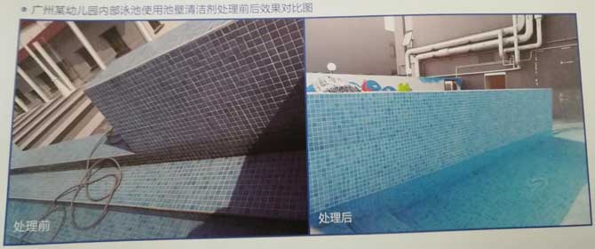 大面積池體著色或結垢:將本品按照10克/噸的用量投入池內,保持池水pH6.0~6.5,維持6~8小時,可解決池體著色與結垢問題。