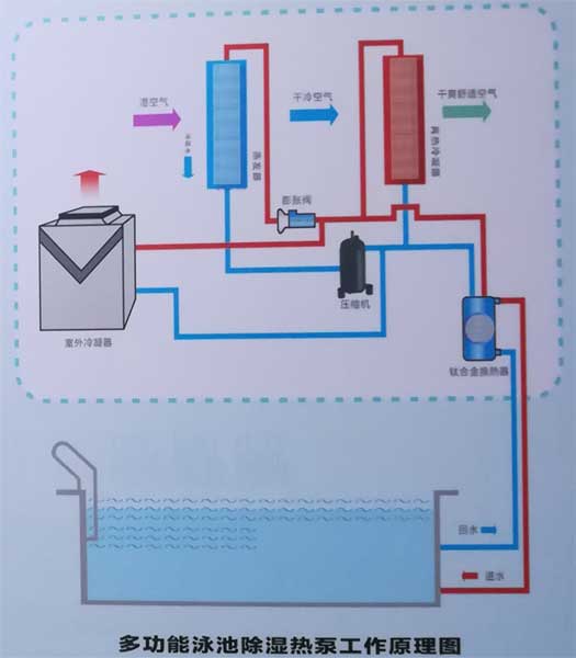 利用熱泵原理,以電能驅動壓縮機制冷劑循環工作,以達到及空調(制冷、采暖)、除濕、池水恒溫、新風等功能為一體的機組。