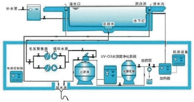 第一步驟:泳池水處理(經過過程物化方法除去水中一些物質的過程)系統(tǒng)及工藝流程水處理系統(tǒng);泳池水質處理系統(tǒng)從靜態(tài)平衡任務事理,在輪回處理過程中達到水質的徹底污染。泳池水經過溢流槽回到平衡水池,會同補水一同進入回水管線,在回水泵驅動下流經毛發(fā)聚集器并濾除毛發(fā)和顆粒雜物;而加入絮凝劑,在打泳池水循環(huán)系統(tǒng)。