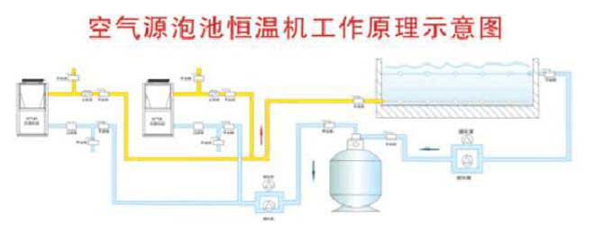 近年來,空氣源熱泵作為太陽能加熱輔助系統,越來越多的與太陽能相結合,為泳池系統提供熱源。空氣能泳池恒溫機組利用制冷劑作介質,輸入少量的電能,吸收空氣中的熱能,產生熱水。制冷劑汽化溫度低,在-40℃即可汽化,故它與外界溫度存在溫差,冷媒在蒸發器內吸收外界溫度后汽化成為低溫低壓的氣體,通過壓縮機壓縮變成高溫高壓氣體,再經冷凝器與水交換熱量后,被冷凝成液體,經電子膨脹閥節流降壓后變成低溫低壓的液態,然后在蒸發器中吸收空氣中的熱量后繼續被壓縮機吸入,不斷循環,制取熱水,維持泳池的恒溫。