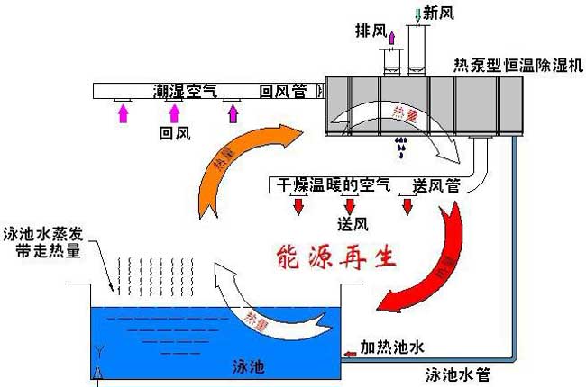泳池區有大量水分蒸發,消毒的余氯揮發,是高濕環境,易產生細菌、霉菌,極易破壞室內空氣質量和裝飾材料。傳統做法是通風除濕,技術簡單,但通風除濕的做法導致室內暖濕空氣中的能量被白白浪費,有節能宗旨。